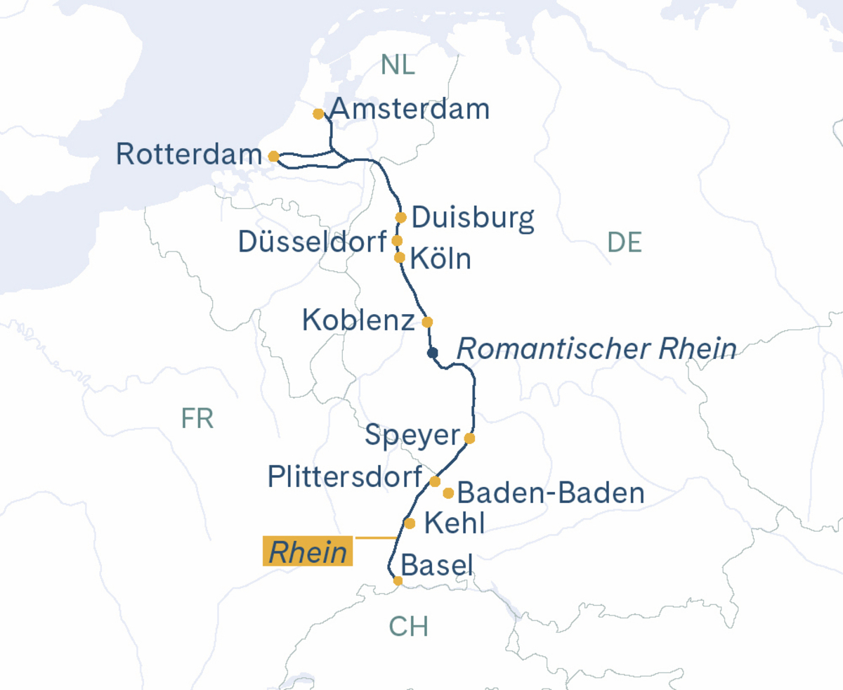 Individuelle Anreise nach Basel. Einschiffung ab 15:00 Uhr und um 16:00 Uhr heisst es «Leinen los!». Bei einem Willkommensdrink erhalten Sie wichtige Informationen zum Bordleben und zur Reise.