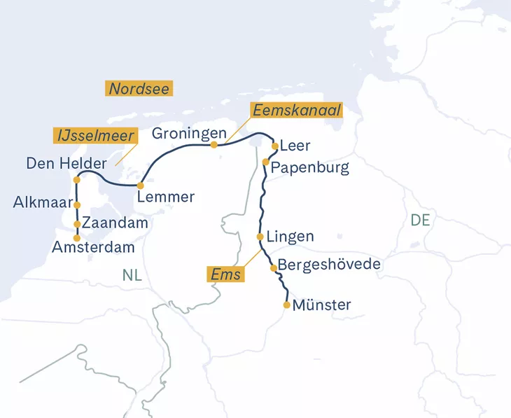 Tauchen Sie ein in eine unvergessliche Flussreise voller bezaubernder Landschaften und kultureller Schätze. Von der historischen Stadt Münster gleiten Sie sanft über den Dortmund-Ems-Kanal und die idyllische Ems in Richtung Lingen. Hier erwartet Sie ein faszinierender Besuch im Moormuseum Meppen, das Ihnen die geheimnisvolle Moorlandschaft und ihre Geschichte näherbringt. Weiter führt die Reise durch das sanfte Emsland mit seinen charmanten Kanälen und der traditionsreichen Meyer-Werft in Papenburg – eine Symbiose aus Natur und maritimer Geschichte. Beim Übergang in die Niederlande offenbart sich eine Welt voller Wasserwege: Über das funkelnde Sneekermeer und den malerischen Prinses Margriet-Kanal gleiten Sie nach Lemmer, wo die friesische Gelassenheit spürbar wird. Ein Farbenspiel aus leuchtenden Tulpenfeldern erwartet Sie bei dem zauberhaften Besuch einiger Tulpenfarmen – ein echtes Fest für die Sinne! Schliesslich erreichen Sie Amsterdam, die „Venedig des Nordens“, mit ihren verwinkelten Grachten, historischen Fassaden und einem unvergleichlichen Flair. Lassen Sie sich auf dieser romantischen Reise vom sanften Flusswind tragen und geniessen Sie die schönsten Momente zwischen Natur, Kultur und Tradition.