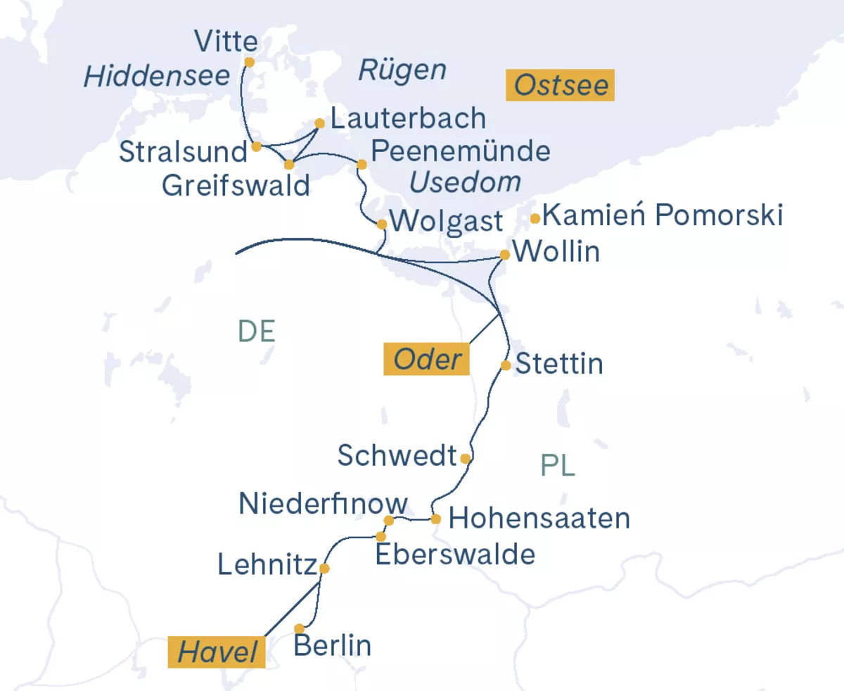 Auf einer Flusskreuzfahrt auf Havel und Oder abwärts Richtung Ostsee erschliessen Sie die naturbelassene Landschaft der Ostseeküste und die erholsame Wirkung der Strand- und Heilbäder.
