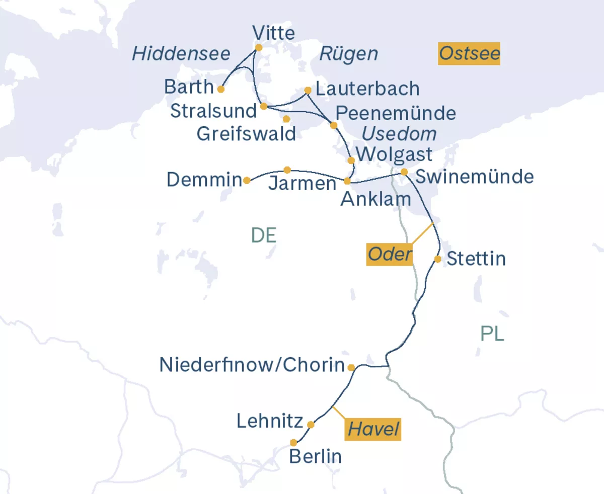 Nur selten kommt es vor, dass auf einer Reiseroute gleich vier Nationalparks und zwei Biosphärenreservate durchfahren oder gestreift werden. Die Naturlandschaften entlang von Flüssen und Kanälen sowie an den Ufern des Haffs und der Boddengewässer sind vielerorts noch unberührt erhalten geblieben und bieten dadurch einer Vielzahl an Tieren, wie den Bibern oder Seeadlern, einen intakten Lebensraum. Nicht umsonst wird das wilde Peenetal mit dem Amazonas verglichen. Doch auch technische Errungenschaften, wie das eindrückliche Schiffshebewerk von Niederfinow oder die geschichtlich interessanten Hansestädte mit ihrer typischen Architektur, machen diese Reiseroute, die Sie bis zu den Kreidefelsen Rügens, dem maritimen Hiddensee, den Sandstränden Usedoms und der Halbinselkette Darss-Zingst führt, so einzigartig.
