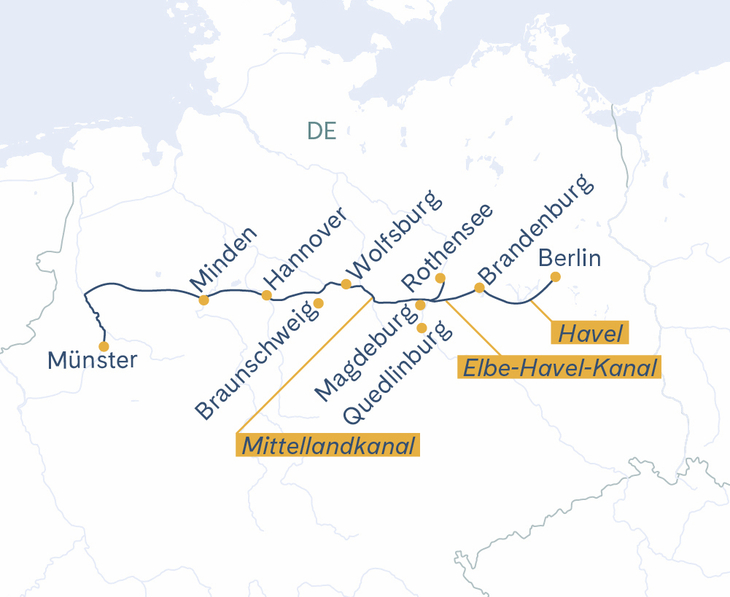 Individuelle Anreise nach Münster zum Anleger und Einschiffung. Abends startet die Flussreise über den Dortmund-Ems-Kanal.