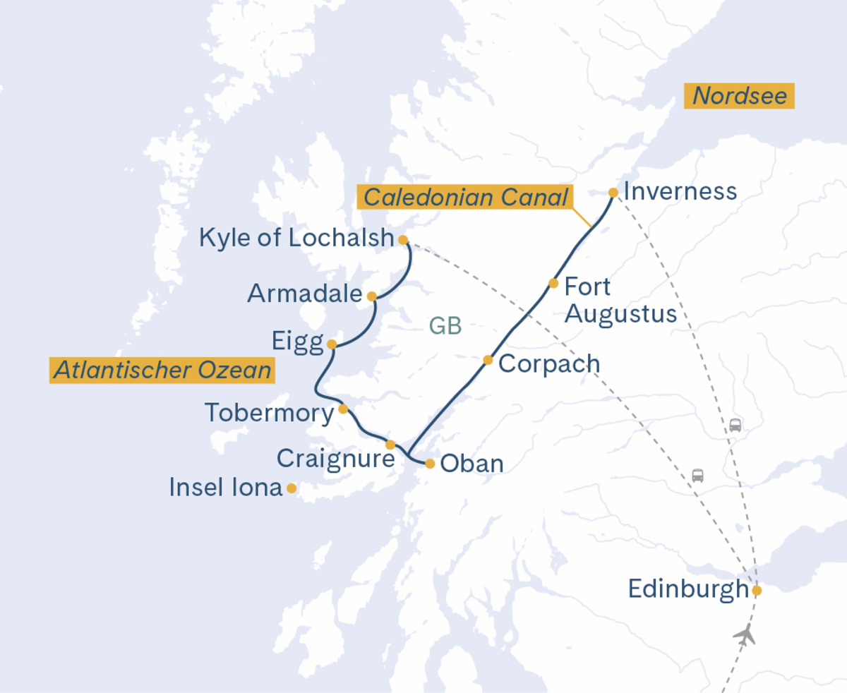 Die MV Lord of the Highlands mit ihrer familiären Atmosphäre von nur maximal 37 Gästen und einer zuvorkommenden Crew fährt Sie durch die traumhaften Seen- und Küstenlandschaften Schottlands. An Bord dieses kleinen, schottischen Luxuskreuzfahrtschiffs können Sie sich bequem und stilvoll entspannen, während Sie unzählige Highlights entdecken: die historischen Schleusen des Caledonian Canal, die Isle of Mull mit dem beeindruckenden Duart Castle und die kleine Isle of Eigg, auf welcher Sie einen Einblick in den Alltag der nur ca. 100 Bewohner:innen erhalten.