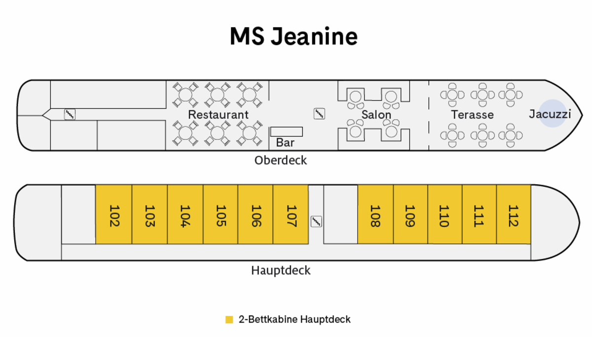 Alle Kabinen sind stilvoll, komfortabel und mit Dusche/WC, Föhn, TV und Safe eingerichtet. Die Kabinen auf dem Hauptdeck (ca. 8 m²) sind mit zwei Einzelbetten und nicht zu öffnenden Fenstern ausgestattet.